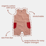 These 100% organic cotton baby shorties pack let little ones crawl, sit, and stretch easily. With a soft buttoned neckline, kangaroo pockets, and summery colours, these unisex baby onesies are as cute as they are comfy.